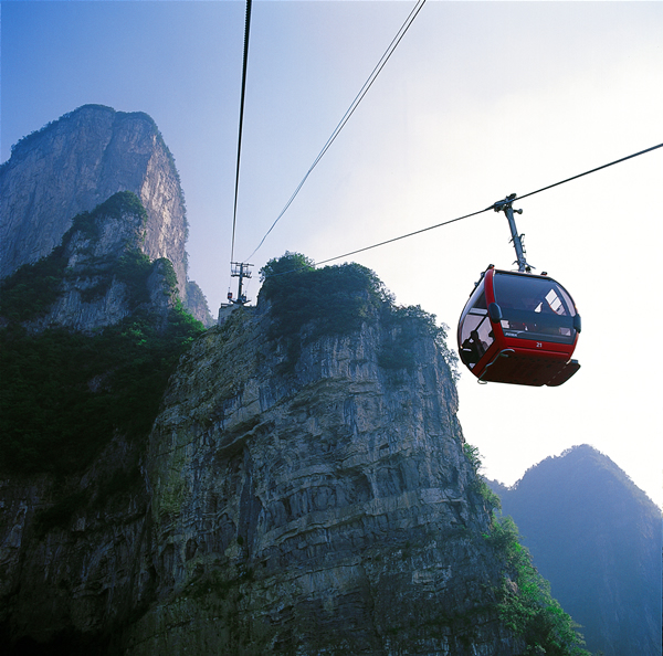 天门山索道线路斜长 7455 米 ,它以张家界市中心的城市花园为起点,直达天门山顶的原始空中花园,犹如一道彩虹飞渡“人间” “ 天上 ” ,又象一条巨龙腾翔 素云苍穹,依山籍壁,拔地冲天,恢宏壮观。 天门山索道自 2003 年元月 15 日开工至 2004 年底竣工,总投资 2.26 亿元人民币。由于索道沿线山体高绝奇险,地质地貌复杂多变,设计和施工难度远远超乎一般,整个建设过程艰辛无比。天门山索道不仅凝结了中外参建人员的智慧和汗水,也融合了当代索道工程最先进的科技成果,堪称当代索道工程建设中的一个奇迹,一个里程碑。 天门山索道综合了世界上最尖端的客运索道技术,索道共有 57 个支架,其中含 3 个水平救护支架,支架由国内生产,主要设备均由法国波玛公司供应,索道钢绳来自于法国, 98 个吊厢来自瑞士 CWA 公司,单个造价高达 20 万元人民币。。索道的 运载索 张紧系统采用液压张紧方式,设一个中间驱动站,是世界上最长的单线循环脱挂抱索器车厢式索道。轿厢体高 2 米 ,单个造价高达 20 万元人民币。索道钢绳为 6 × 36WS 型,直径 50.5 毫米 ,每米重达 10 公斤 ,索距 6.2 米 ,索道运行速度为每秒 6 米 ,按顺时针方向运行,每两个吊厢的间距为 172.8 米 ,时间间隔为 28.8 秒,单向运量为每小时 1000 人,最大爬坡角 38.6 度,这在世界均属罕见。 天门山索道最大的亮点就是它的爬坡面支架的设计 ,这个支架共有压索轮 96 个,托索轮 16 个,它综合了现代物理学、现代工程学、现代制造业中最先进的理论和成果,应用了世界最先进的索道技术,从而使这段索道总给人一种荡气回肠、气势冲天的感觉。 同时为应对临时发生的特殊情况,天门山索道设计了 “ 水平救护 ” 和 “ 垂直,用于索道突然处于全面瘫痪时将游客安全救护至地面,这是目前世界上索道中的一套最完备最先进的救护系统。并为确保特殊天候下的安全,索道站房都安装了防雷电设备。